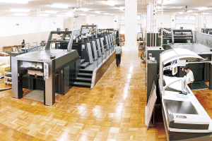 印刷現場では大きな改革に乗り出した。16年末、菊全判8色両面兼用機2台と、同2色両面兼用機2台に代え、drupa2016世代の最新鋭の8色両面兼用機「スピードマスターXL106-8P -18K」1台を導入した。さまざまな自動化システムが搭載されているが、インラインの自動色調・見当調整システムが内蔵されているのが特徴だ。18年現在、同機を含め両面兼用機4台と片面7色機1台が稼働している。