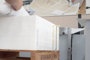 紙面検査装置搭載の最新鋭機で印刷し、不良紙を「ミューパイルジョガー」で抜いていく